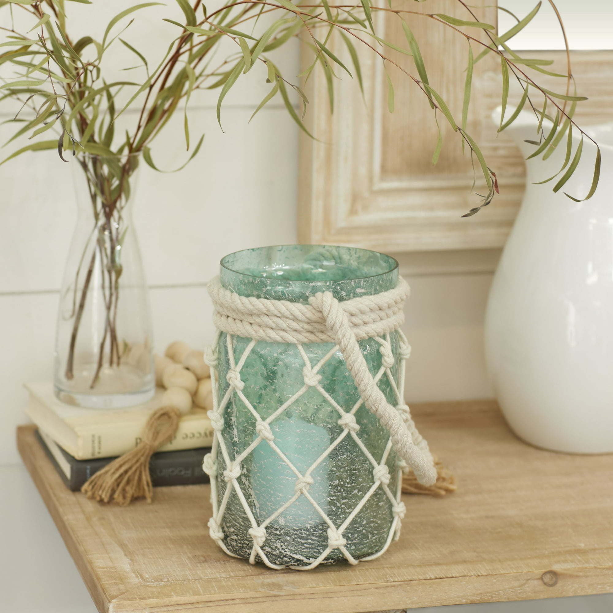 DecMode Blue Glass Decorative Candle Lantern with Rope Handle makes a perfect addition to any home