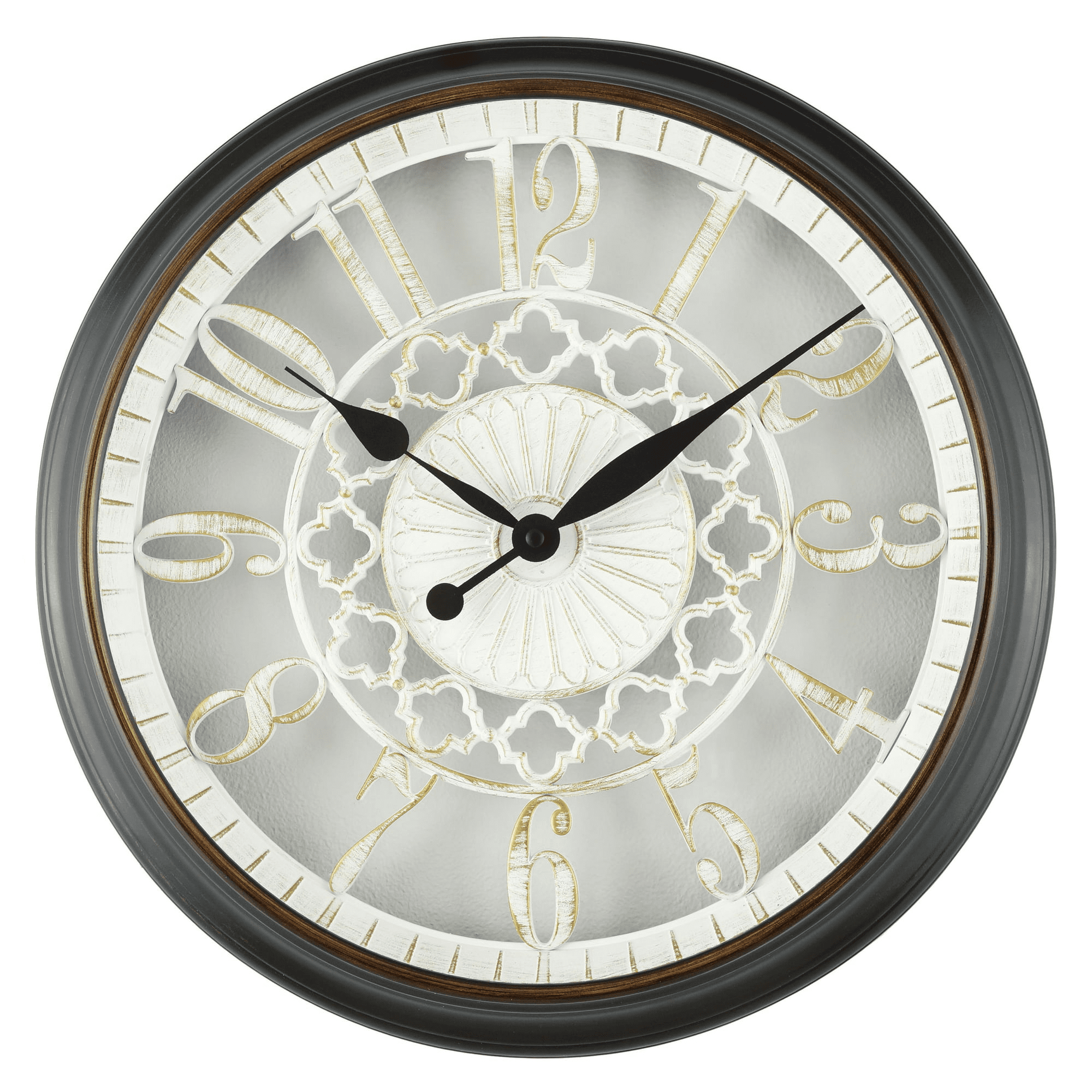 Complement your home's décor by adding this mainstays 10" white cutout wall clock! The clock's frame features a beautifully hand applied oil rubbed bronze finish, which contrasts the white center dial design. Within the frame, radiating arabic numbers rotate around the dial's center moroccan pattern design. The white cutout dial also features hand applied bronze brushing. Satin black hour and minute hands are a striking contrast and are easily visible against the dial. A flat glass lens protects the dial and handset. The clock's quality quartz movement ensures precise timekeeping. This clock would be a great decorative addition to a kitchen, bedroom or home office.