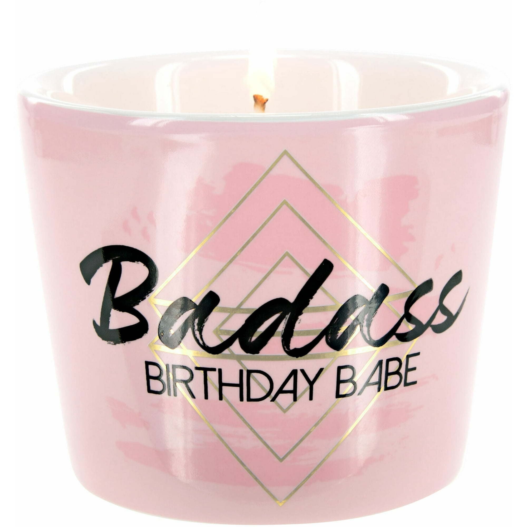 IN-HOUSE DESIGN: "Badass Birthday Babe" text decal and accompanying gold detailing are both applied to the front of the candle.