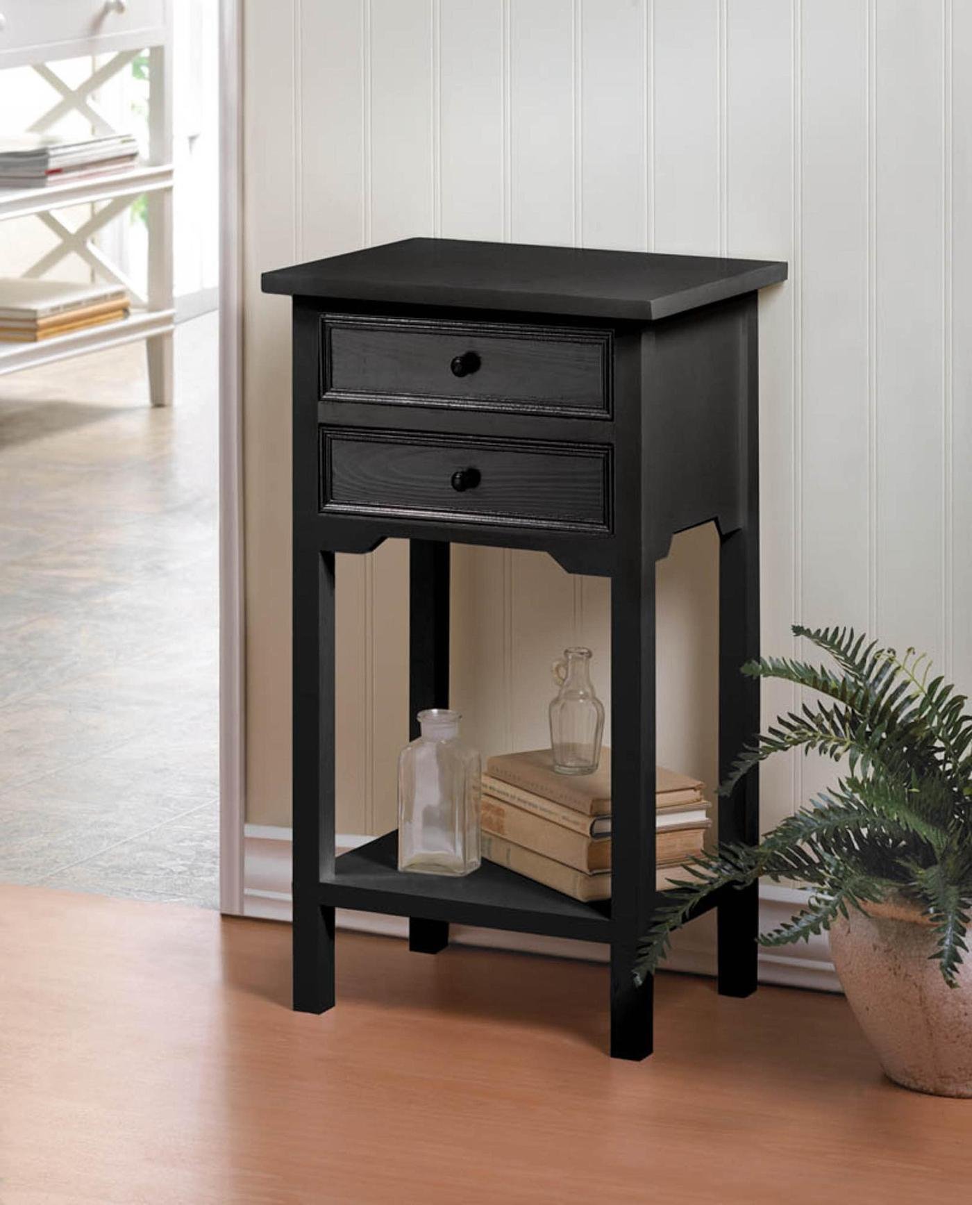 • This simple yet elegant two drawer table is finished with a black stain that allows the beauty of the pine wood to show through. Maximum weight limit: 25 lbs.