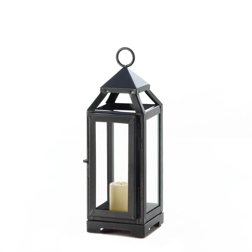 This dark gray iron candle lantern looks great on its own, but it's beauty is multiplied when you light a pillar candle inside. The decorating options are endless with this incredible lantern. Candle not included. Weight 1.2 pounds. 3.62" x 4" x 10.8". Iron, Glass. UPC Number: 849179033262.