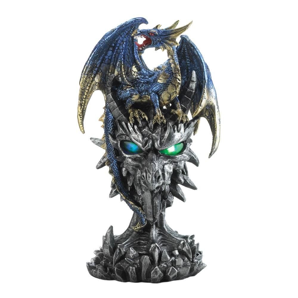 • Ready to go battle, this dragon, perched atop an intricate silver monument, has fiery red eyes and sharp jagged teeth . This statue features metallic blue and gold accents with a light up LED's eyes making it a statement piece in any room.