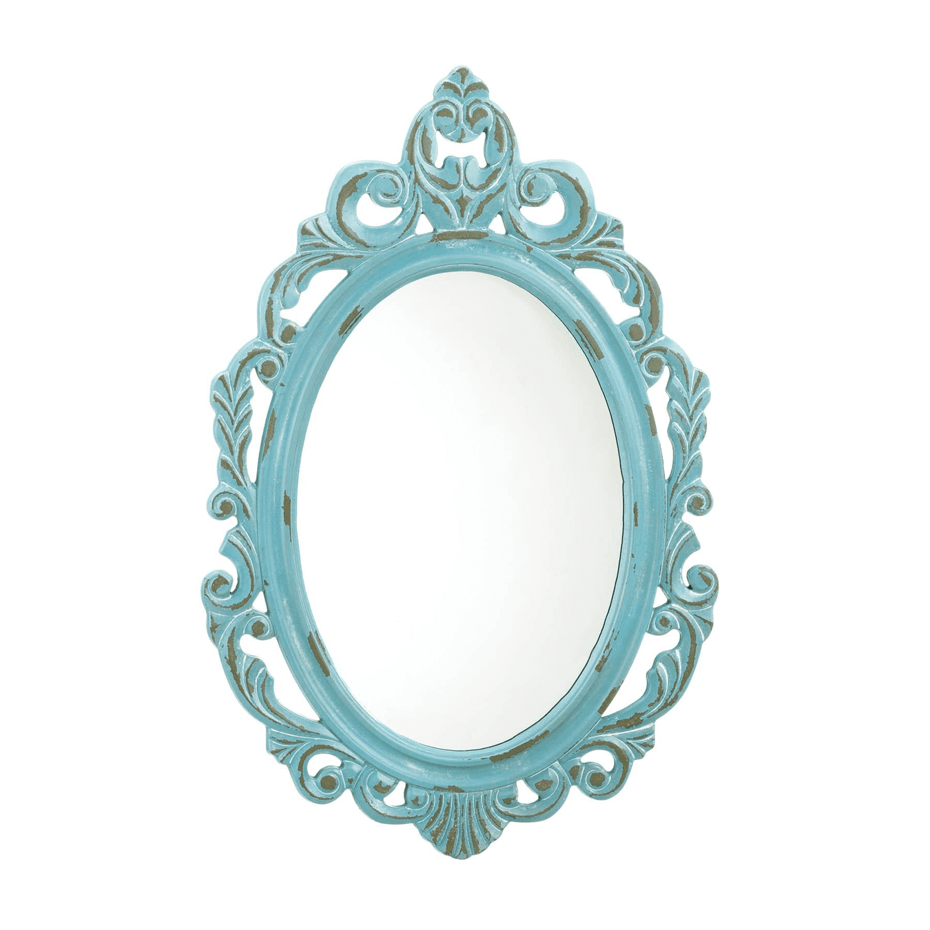 Add a pop of color to your walls and living space with this fun baby blue wall mirror. The mix of ornate design details and the modern blue color will add some flair to your bedroom, bathroom or entryway. Hang this mirror anywhere you choose. Triangle hook on back for hanging. Reflective mirror measures 9 " X 14" high. Weight 3.2 pounds. 15.5" x 0.5" x 23.5". MDF Wood, Mirror. UPC Number:849179042424.