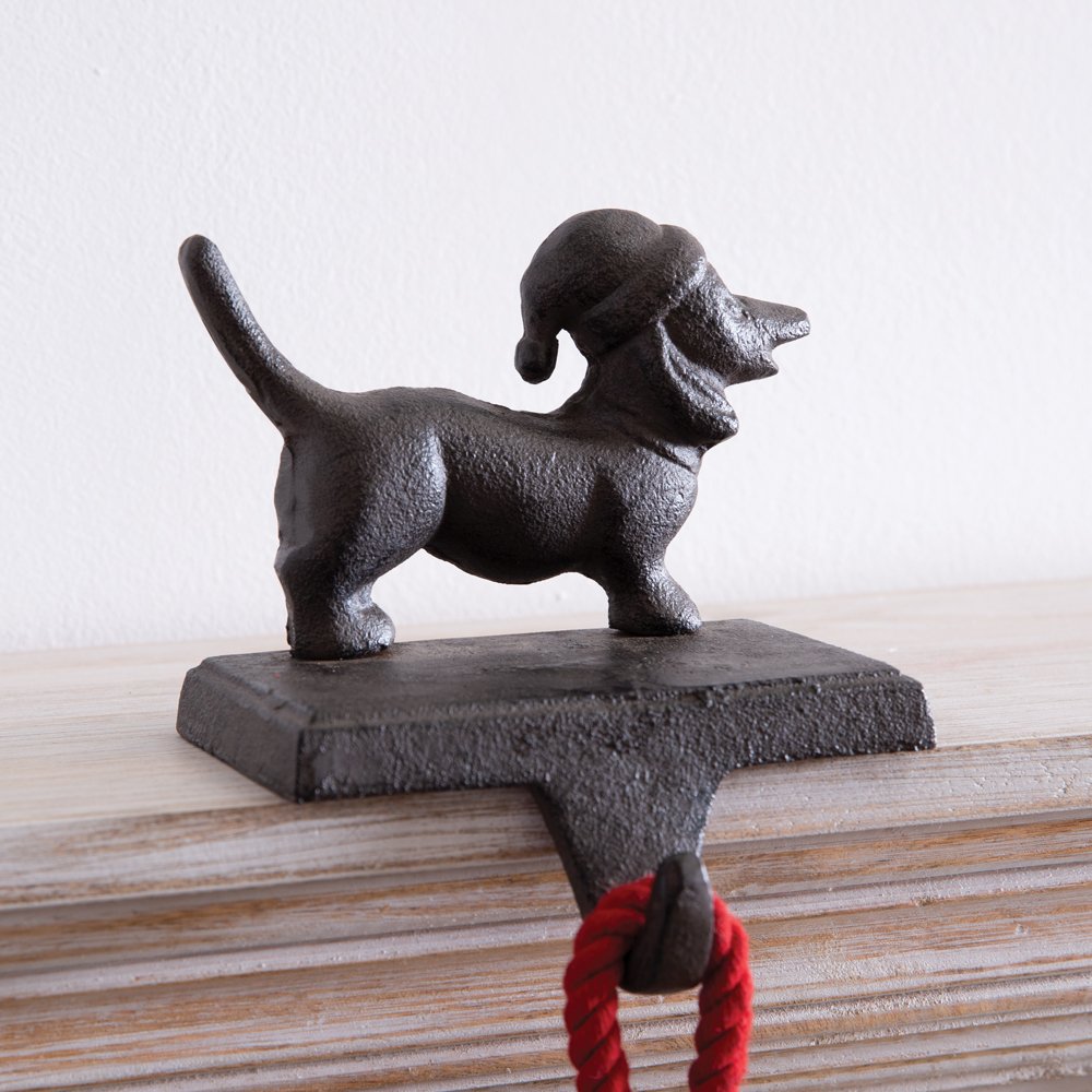 Our furry friends deserve Christmas treats too! Place this Dachshund Stocking Holder among your own on the mantle to surprise your fur child with bones and toys from Santa. Item is made of cast iron. Holds a normal sized stocking.