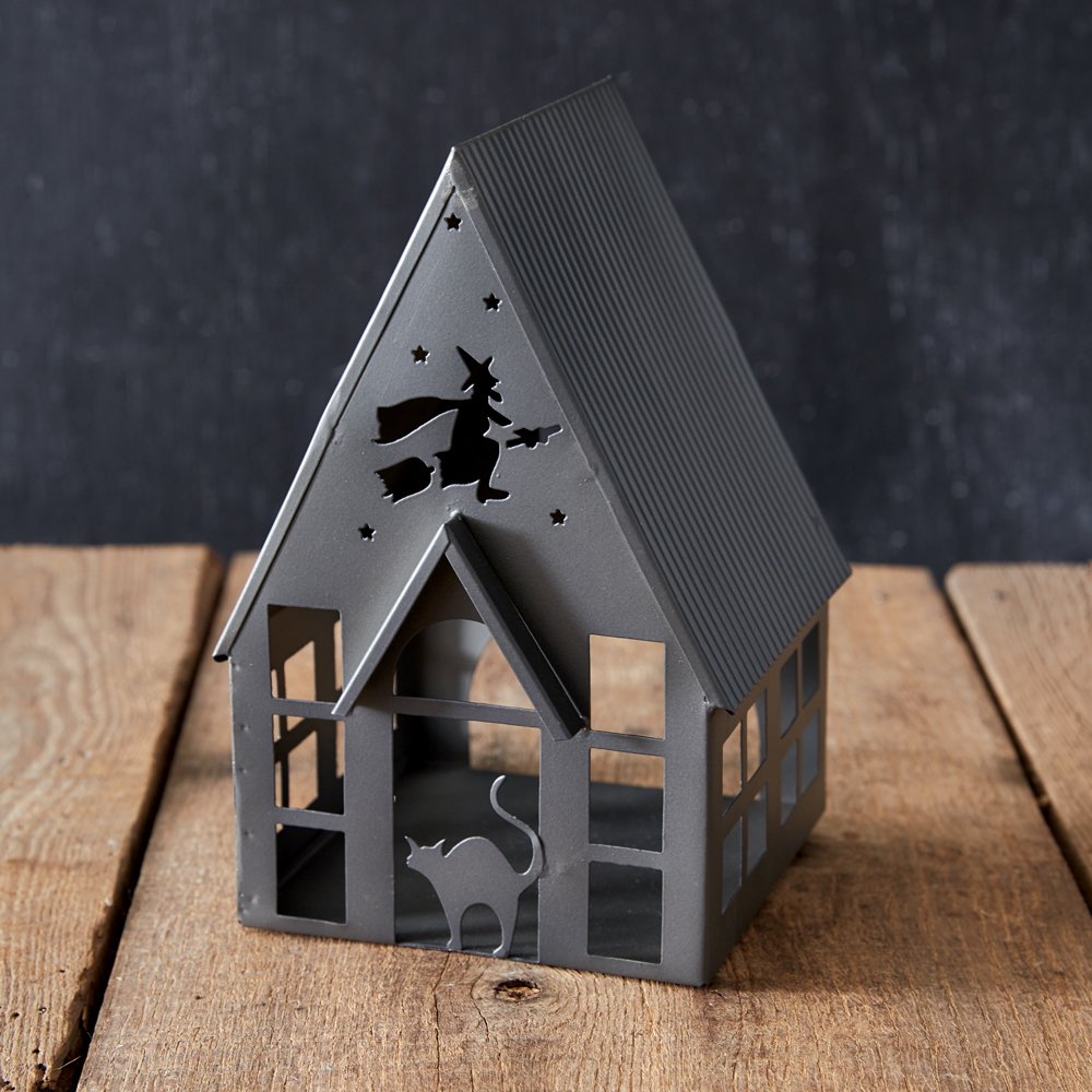 Bring a spooky touch to a home with our Halloween Houses Collection. Featuring a witch and an arched-back cat in an enchanted den, this luminary is sure to scare this season. This den is made of metal and features an area to insert a tealight, not included. This item would be great displayed in a centerpiece, alone, or with any of our other Halloween House luminaries. Each house includes four surface protective pads.