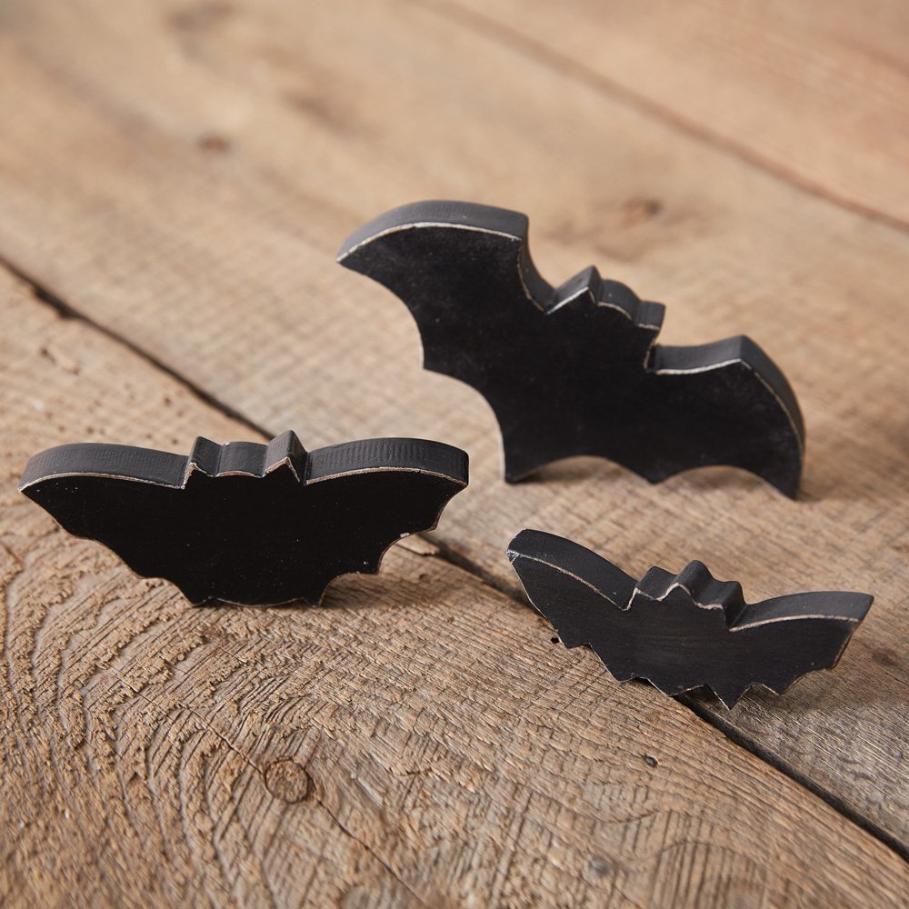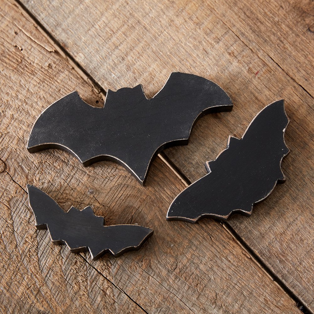 Bats don't always have to be eerie and spine-chilling. These charming little bats are a nifty decoration to add to a tray, tabletop, or shelf. Created by hand and fashioned from wood, no two pieces of wood will be identically the same. Medium bat measures 7¾''W x ½''D x 2''H and smallest bat measures 3¾''W x ½''D x 1¼''H.