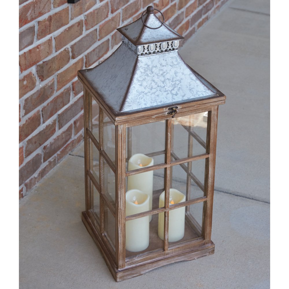 This grandiose lantern's charming, weathered look is the ideal addition to farmhouse decor. Lantern features LED flameless candles inside creating a carefree, enjoyable experience. Simply turn on candles and enjoy the flickering light. Each lantern features a hinged lid to access the inside. Candles require 9 AAA batteries, not included.