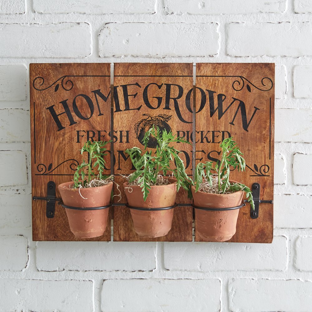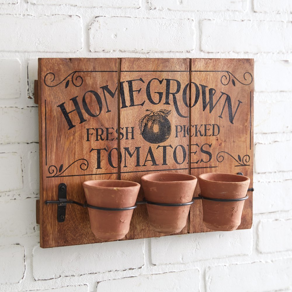 Grow your own mini tomato garden from these planters! Sign is made of sturdy wood with a ''Homegrown Fresh Picked Tomatoes'' message with three clay pots attached by a metal holder. To hang, use its two sawtooth hangers. Pots are 3'' dia.