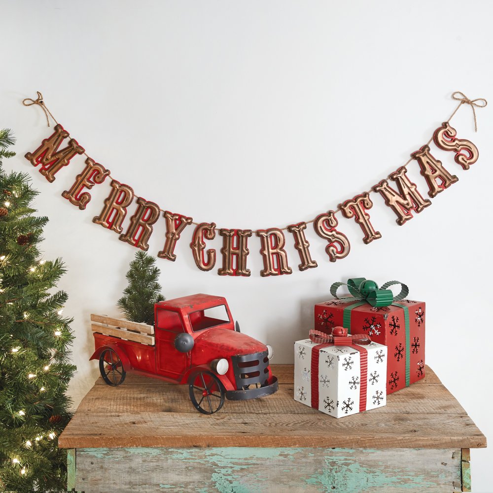 Celebrate at your Christmas party with style when you add this Merry Christmas Banner to your wall. It features red, wooden letters with a bronze metal finish on its front, giving it a vintage looks. It is strung by jute rope with plenty of room to hang. The rope from end to end measures 153''W.