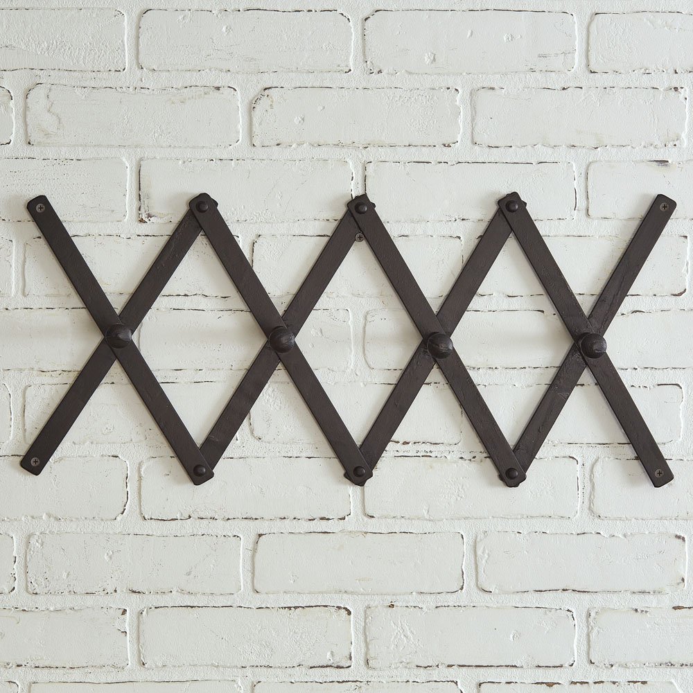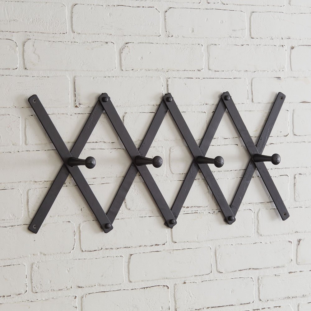 Simple and adjustable, this black accordion coat rack has four hooks for hanging coats, scarves, and bags. To hang this up, it has a small hole on the top and bottom of each edge for a nail or screw.